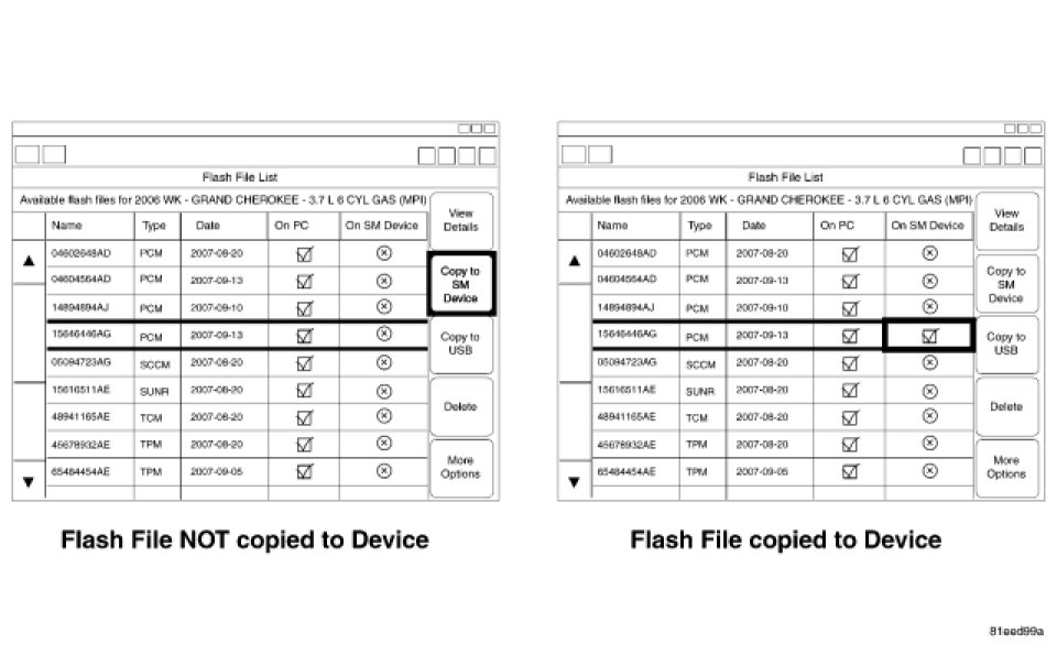 5. In the Manage Files screen, highlight the downloaded flash file and select "Copy to SM Device". A green checkmark should now appear in the On SM Device column.
