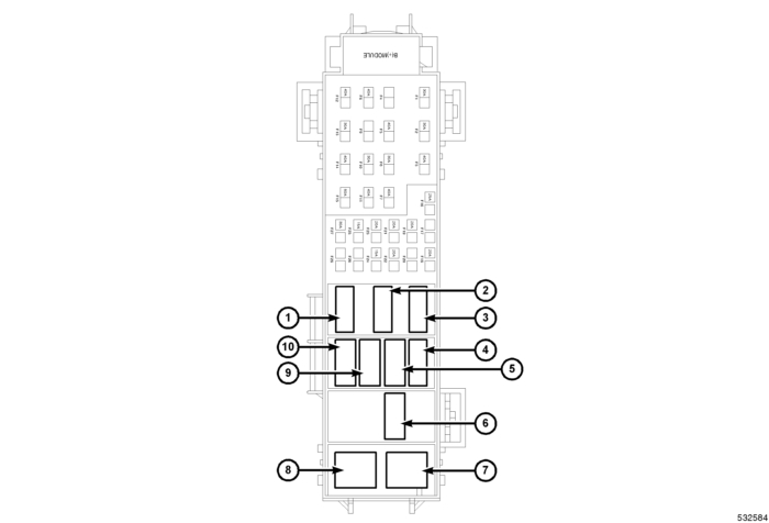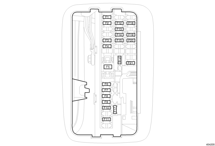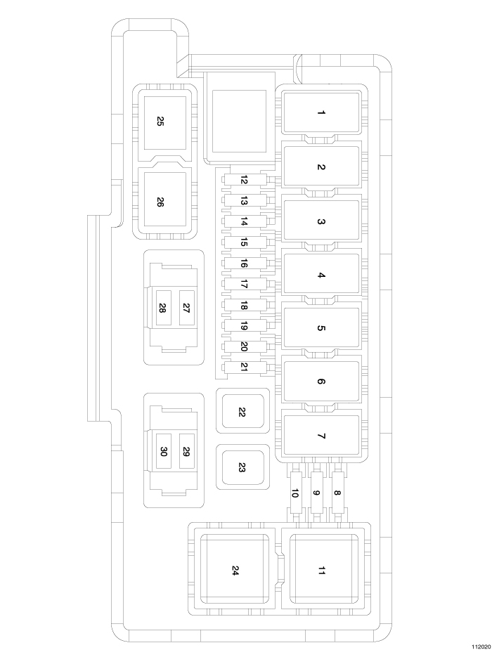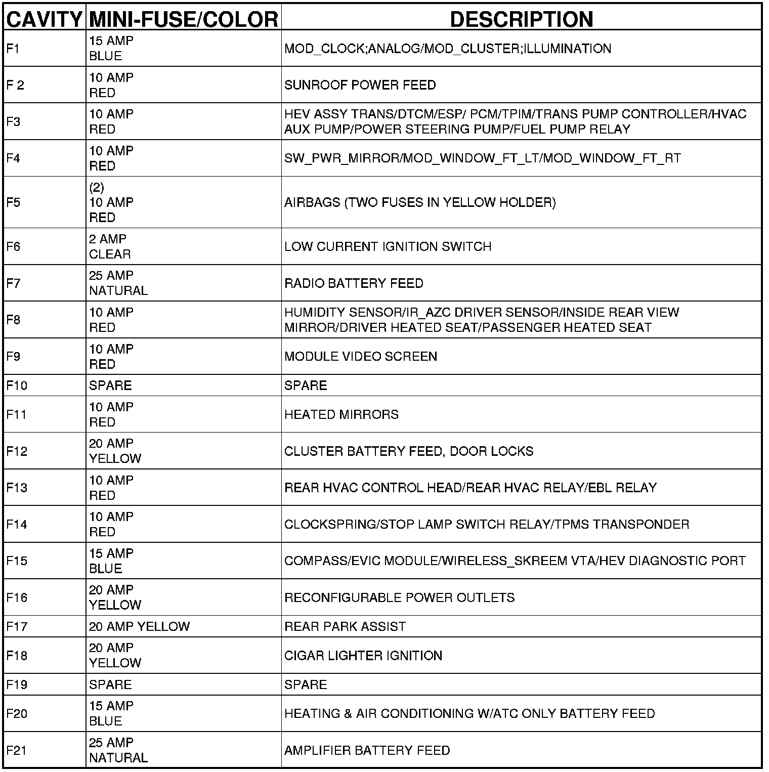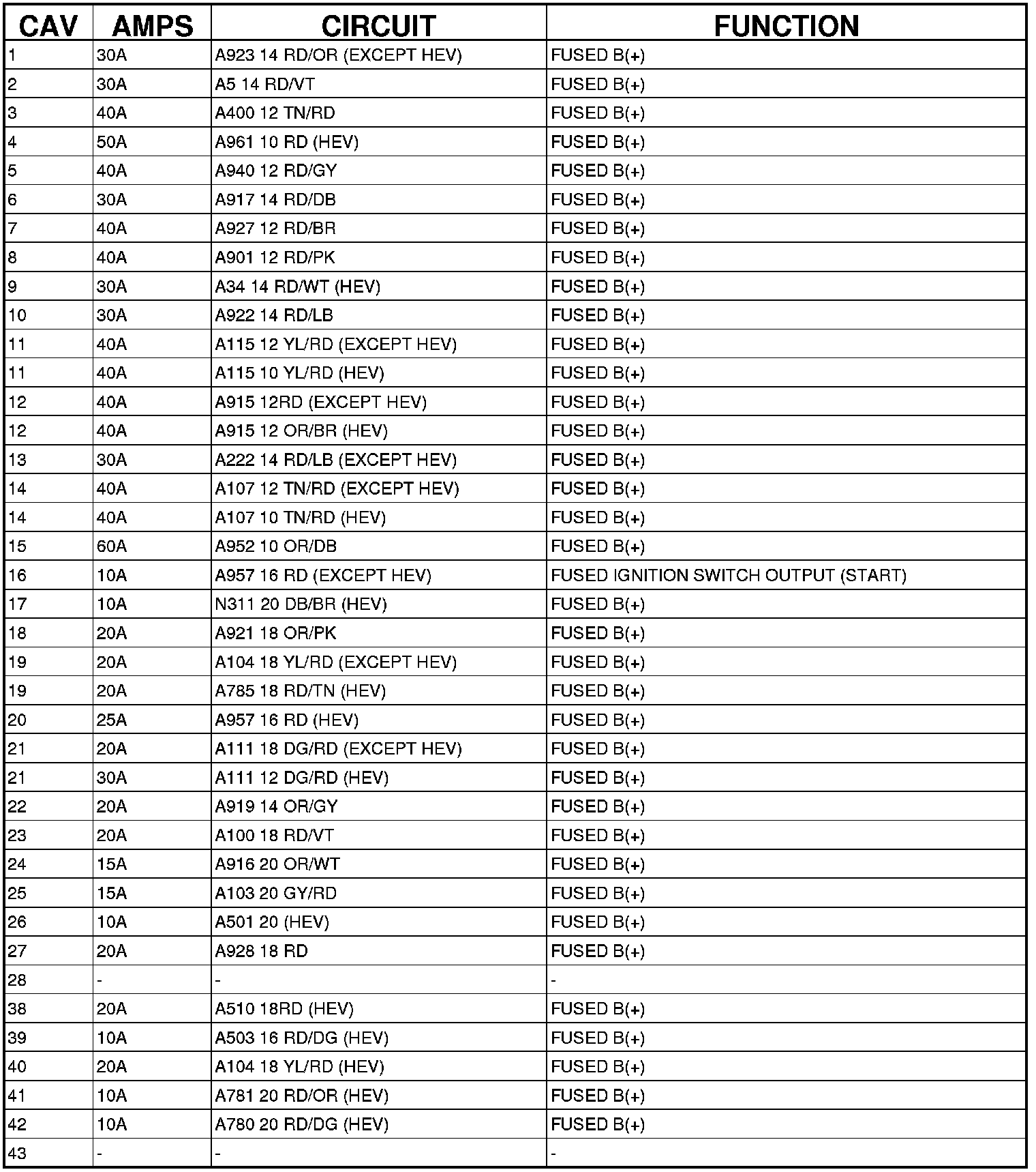 An Integrated Power Module (IPM) is located in the left side of the engine compartment. This center contains cartridge fuses, mini fuses and relays. A description of each fuse and component may be stamped on the inside cover, otherwise the cavity number of each fuse is stamped on the inside cover that corresponds to the following chart.