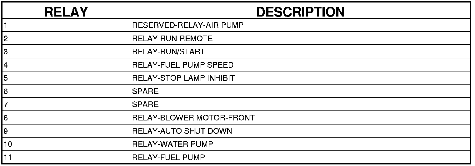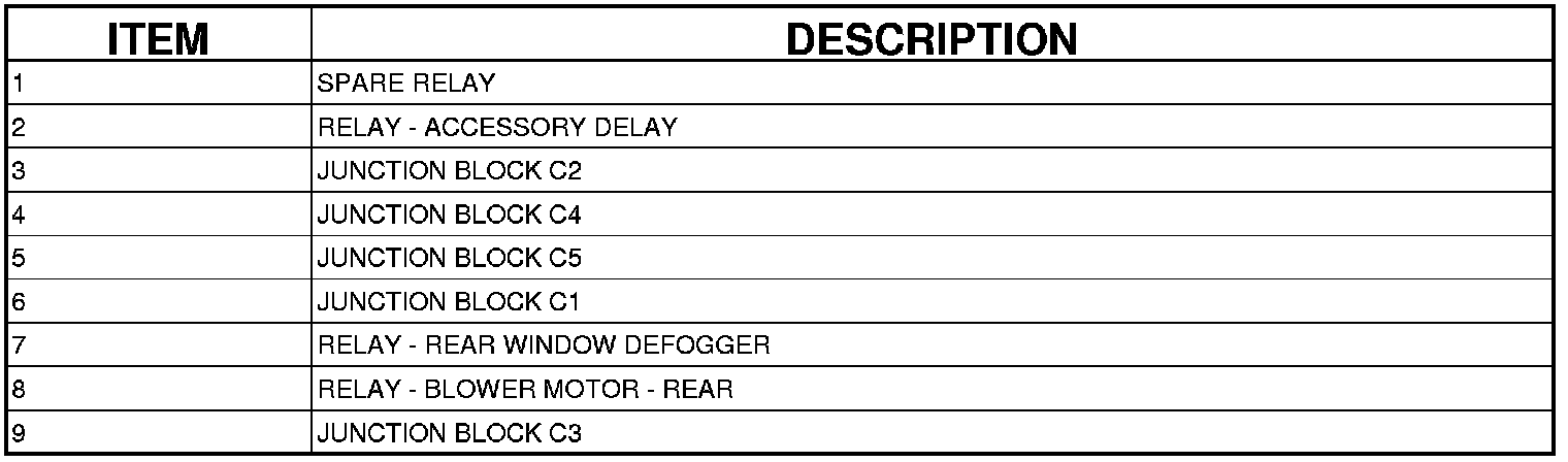 This center contains cartridge fuses, mini fuses and relays. A description of each fuse and component may be stamped on the inside cover, otherwise the cavity number of each fuse is stamped on the inside cover that corresponds to the following chart. These fuses and relays can be obtained from your authorized dealer.