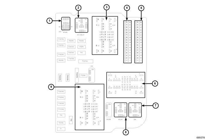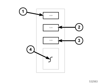 The fuse block contains blade-type mini-fuses, relays, and circuit breakers for high-current circuits. It is located in the left kick panel. It is accessible through a snap-in cover.