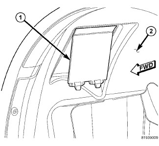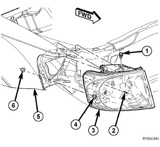 4. Align the ball stud (2) on the back of the lamp with the plastic grommet in the fender reinforcement.