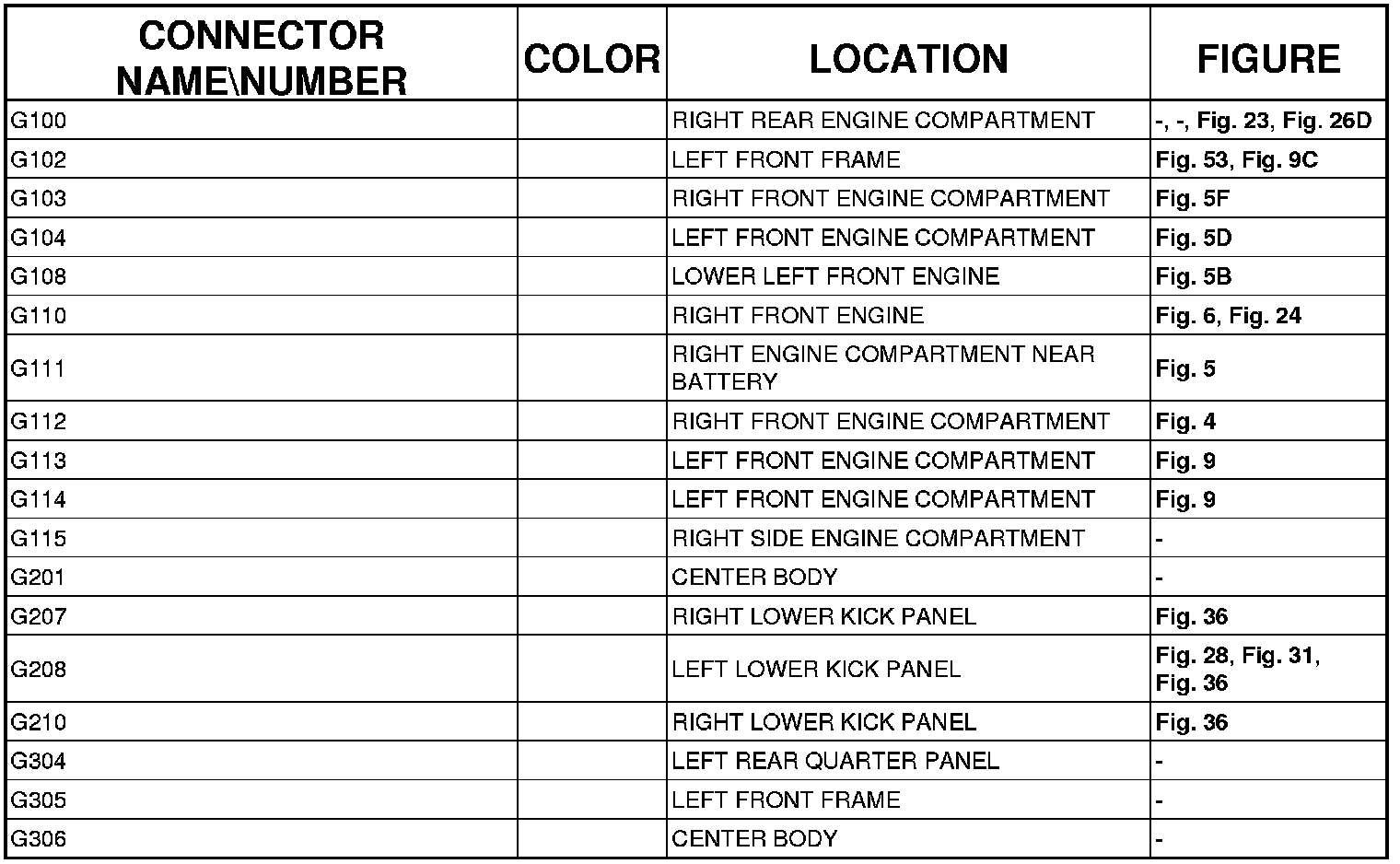 The abbreviation T/O (Take Out) is used in the location column to indicate a point in which the wiring harness branches out to a component.