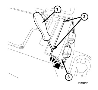 2. Using a small screwdriver or similar flat blade tool (1), gently push down on the clip retainer (2) located at each top corner of the rear A/C-heater control (3). Rotate the top of rear A/C-heater control downwards to release the two bottom retaining tabs from the slots in the center floor console.