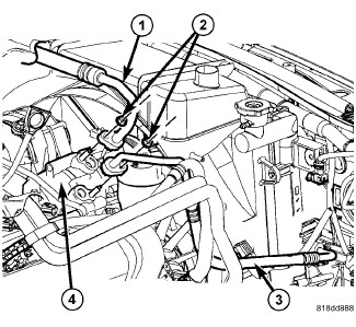 5. Remove the nuts (2) that secure the A/C suction line (1) and A/C discharge line (3) to the A/C compressor (4).