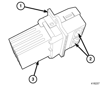 The blower motor power module is mounted to the rear of the HVAC housing, directly behind the glove box. The blower motor power module consists of a molded plastic mounting plate (1) with an integral connector receptacle (2). Concealed behind the mounting plate is the power module electronic circuitry and a finned aluminum heat sink (3).