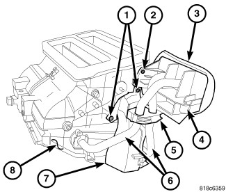 2. Position the heater core tube flange (4) over the heater core tubes (6) and onto the to the passenger side of the air distribution housing (8).