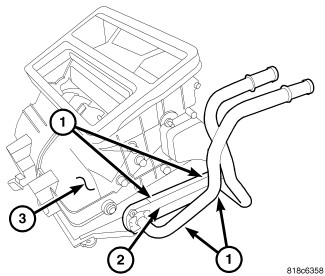 1. Carefully install the heater core (2) into the passenger side of the air distribution housing (3) and engage the four plastic retainer tabs (1) that secure the heater core to the housing. Make sure the retaining tabs are fully engaged.