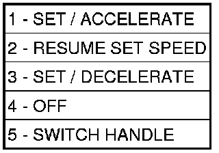 The speed control system is electronically controlled by the diesel Engine Control Module (ECM). A cable and a vacuum controlled servo are not used. This is a servo-less system. Control of the system is accomplished by a 4-position, instrument panel mounted switch (5).