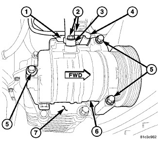 3. Install the three bolts (5) that secure the rear A/C compressor to the compressor mounting bracket (7). Tighten the three bolts in the following order: