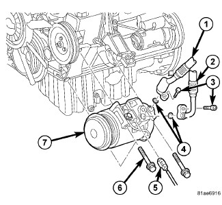 8. Support the A/C compressor and remove the three bolts (6) that secure the compressor to the engine and remove the compressor.