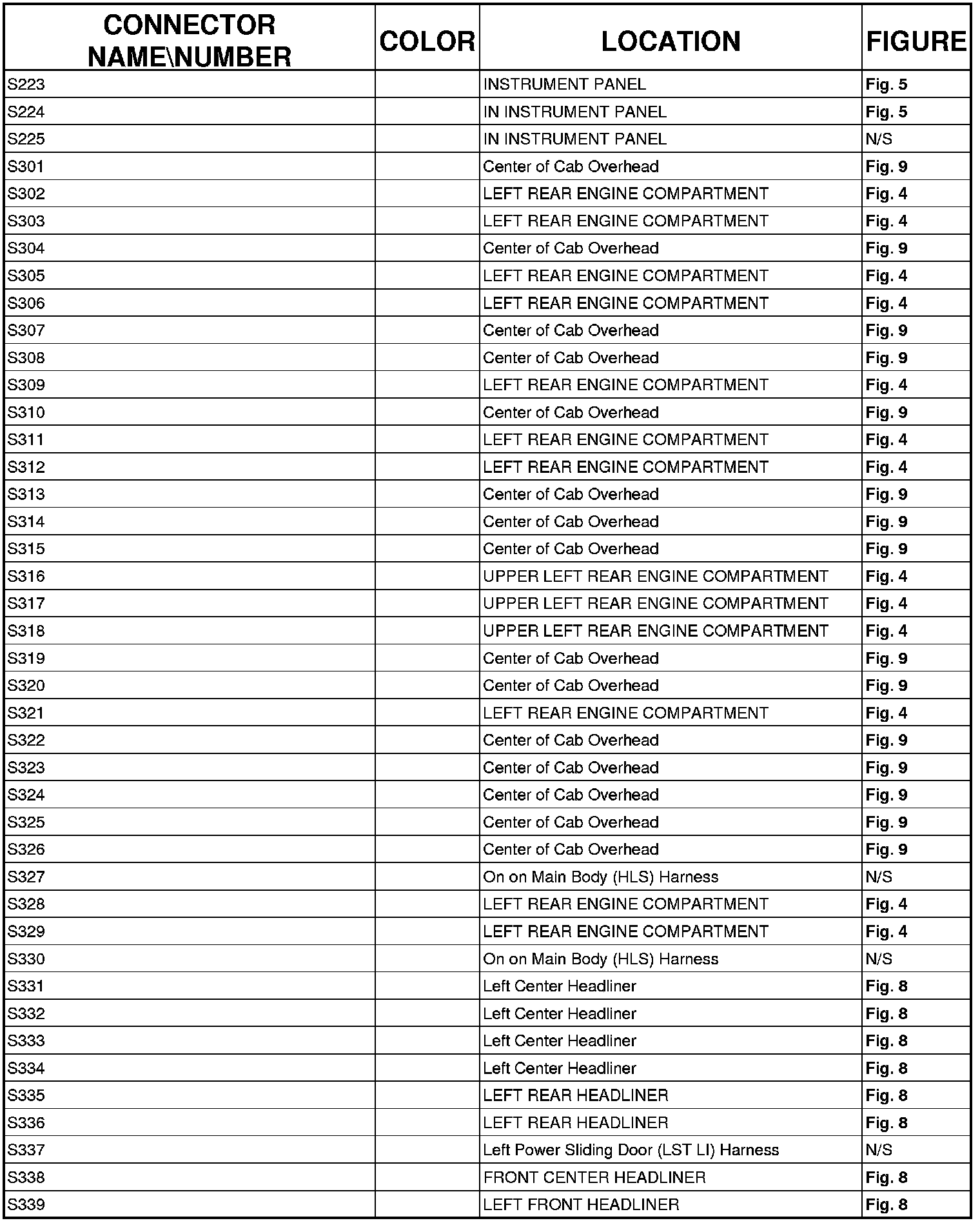 The abbreviation T/O (Take Out) is used in the location column to indicate a point in which the wiring harness branches out to a component.