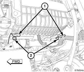 5. For 4.0L only, position the upper radiator hose brackets over the studs and install the retainer nuts (2). Tighten the nuts to 12 Nm (105 in. lbs.).