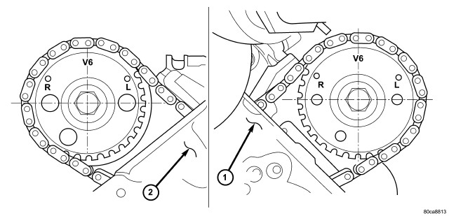 4. Re-index the camshaft drive gear in the chain until the V6 mark is at the same position as the V6 mark on the opposite camshaft drive gear (1,2).