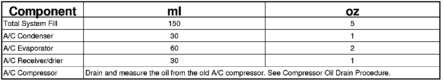Refrigerant oil must be added when an A/C condenser, A/C evaporator or A/C receiver/drier is replaced. See the Refrigerant Oil Capacities chart.
