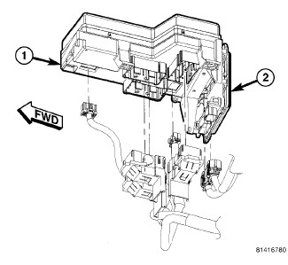 The Front Control Module (FCM) (2) is a micro controller based module located in the left front corner of the engine compartment. The FCM mates to the Power Distribution Center (PDC) (1) to form the Integrated Power Module (IPM). The IPM connects directly to the battery and provides the primary means of circuit protection and power distribution for all vehicle electrical systems. The front control module controls power to some of these vehicle systems electrical and electromechanical loads based on inputs received from hard wired switch inputs and data received on the Controller Area Network (CAN) bus circuit.