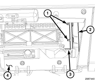 1. Reach through the outboard side of the lower glove box opening to access and reconnect the two instrument panel wire harness connectors to the two connector receptacles of the Passive Entry Module (PEM) (2).