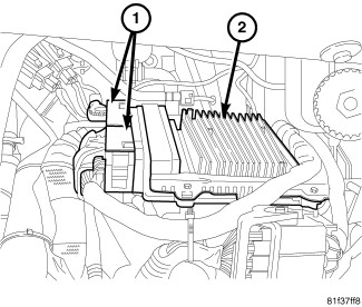 2. Install and lock the 2 electrical connectors (1) to the PCM (2).