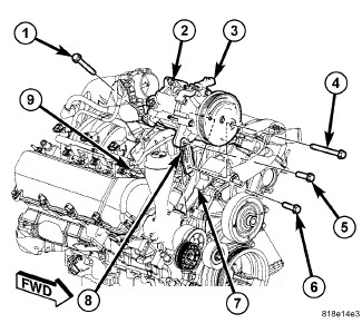 2. Position the A/C compressor to the intake manifold (9) and the engine front cover (7).