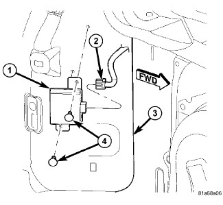 2. Install the two plastic push-in fasteners (4) that secure the module to the inner D-pillar.