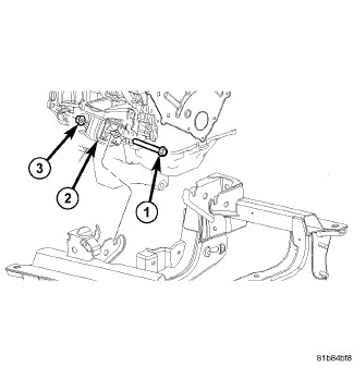12. Support the engine with a suitable jack and install the through bolt (1) and nut (3) to the right side engine mount (3). Tighten the nut to 101 Nm (75 ft. lbs.).