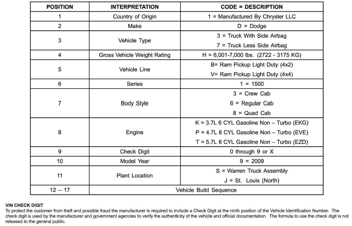 Vehicle Identification Number Decoding Chart