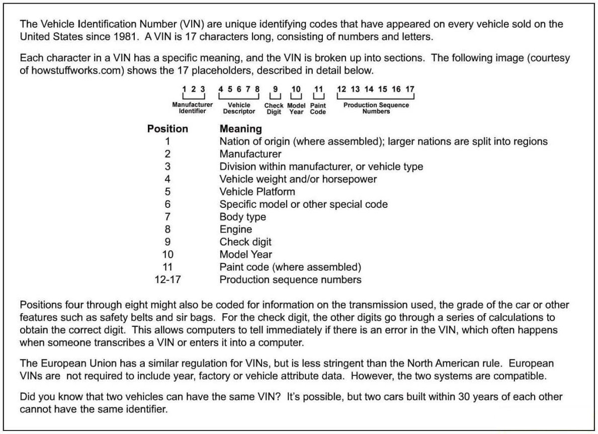 Each character in a VIN has a specific meaning, and the VIN is broken up into sections. The following image (courtesy of howstuffworks.com) shows the 17 placeholders, described in detail below.