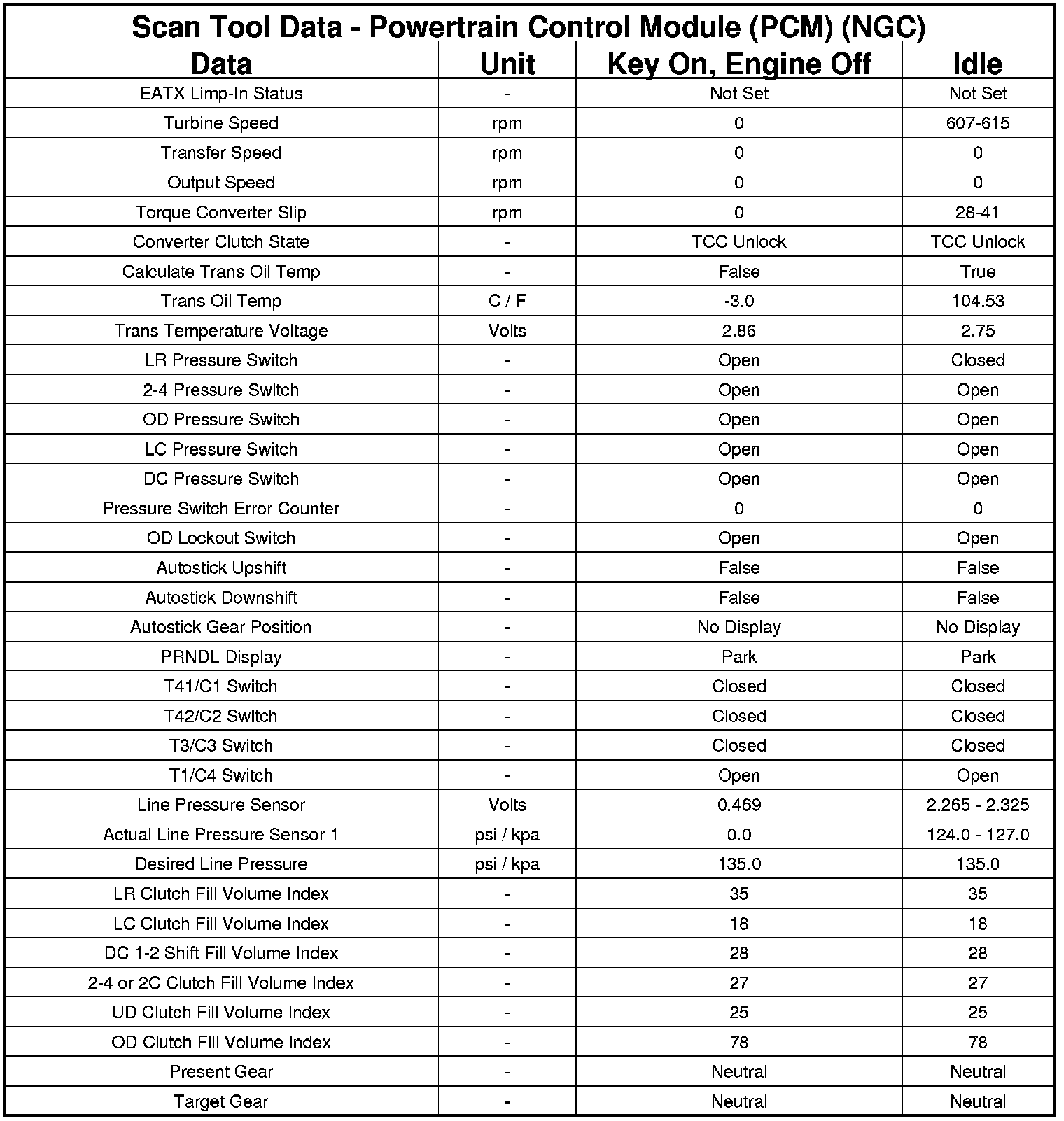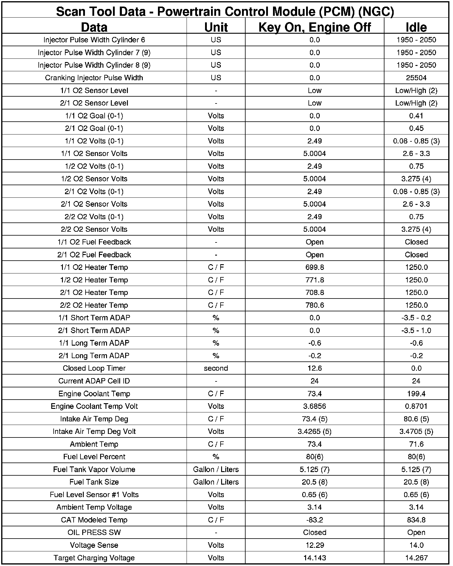 The following chart lists data values taken from the Scan Tool Powertrain Control Module (PCM) data list for the NGC controller. The values were taken at key on, engine off and at idle. The data is to be used for reference only.