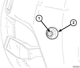 2. Install the fastener (1) from the back side of the speed control switch through the access hole (2) on the back of the steering wheel, and tighten to 1.6 Nm (15 in. lbs.)