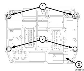 4. Remove bolts (1 and 2), and the PCM (3) from engine.