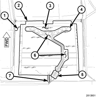 6. Route the ODS pigtail wires that exit the back of the hot melt block (5) through the recess (7) at the back of the seat cushion foam.