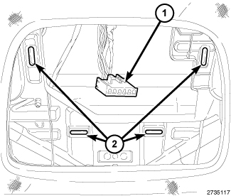 3. Align the snap clips on the overhead console housing with their receptacles (2) in the overhead console bracket.