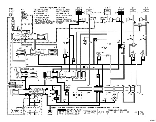 Figure 5 - HYDRAULIC FLOW IN FIRST GEAR (FROM N OR OD)