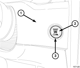 2. Insert the button into the receptacle on the instrument panel (1) and gently press on the chrome bezel ring (3) to seat the button in the receptacle.
