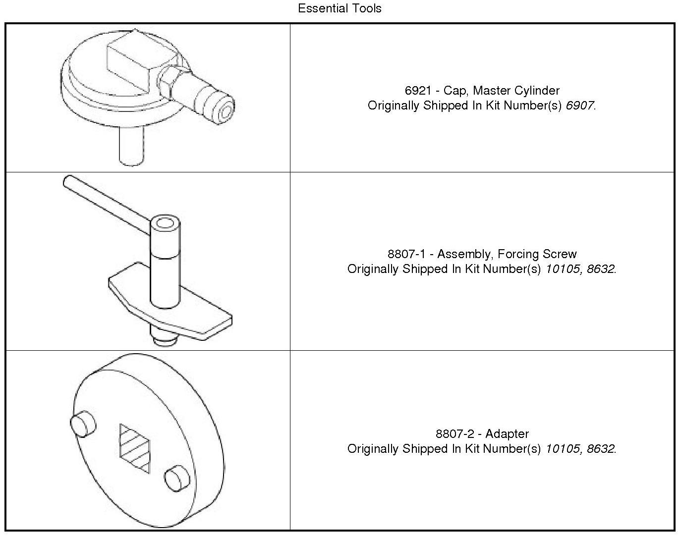 e. Thread the screw drive on (8807-1) down until it contacts the top of (8807-2) which is against the caliper piston. Do not over tighten the screw-drive. Damage to the piston can occur.