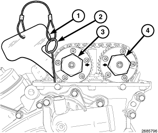 9. Using (10200-3) (2), lift the pawl off of the rack (3). While holding the pawl off of the rack, push (10200-1) (1) into place between the cylinder head and the cam chain guide to force the rack and piston back into the tensioner body. The holder remains in place while the phasers are removed . Service and Repair