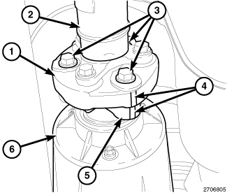 4. Align marks (4) on propeller shaft rubber coupler (1) to rear axle input flange (5).