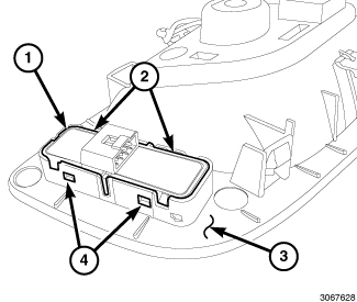 3. Using an appropriate flat bladed tool, gently disengage the four retaining tabs (2 and 4) that secure the memory seat switch (1) to the back of the driver door handle bezel (3).