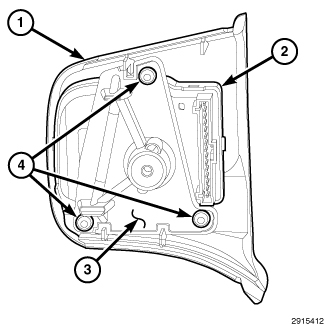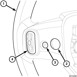 6. From the back of the right horizontal spoke of the steering wheel (1), install and tighten the screw (3) between the remote radio switch (4) and the floating horn switch mounting screw clearance hole (2) that secures the mounting adapter plate, right spoke front bezel and speed control switch to the steering wheel spoke. Tighten the screw securely.