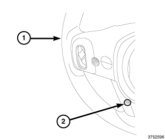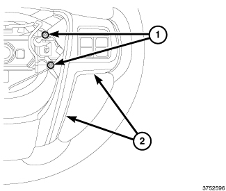 5. Install and tighten the two screws (1) that secure the right front spoke bezel (2) within the hub cavity of the steering wheel. Tighten the screws securely.