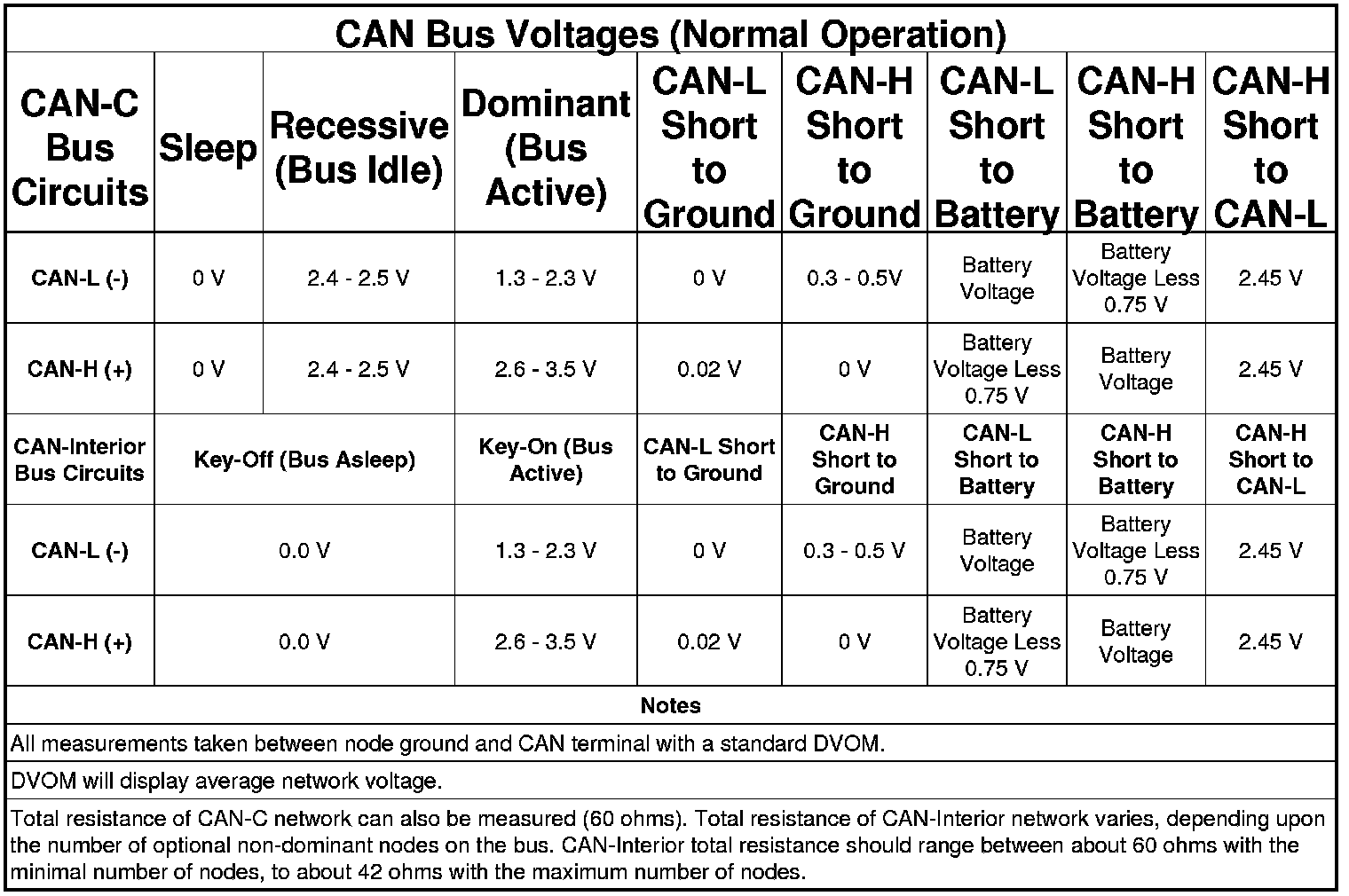 The termination resistance of two dominant nodes is combined in parallel to provide a total of about 60 ohms. This resistance value may vary somewhat by application, depending upon the number of non-dominant nodes on the bus. On the CAN-D bus (or Diagnostic CAN-C) all of the 60 ohm termination resistance is present in the Central GateWay (TIPMCGW).