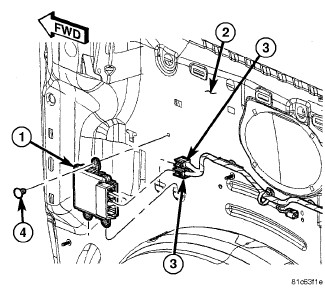 3. Secure the upper mounting tab of the module to the right quarter inner panel using a plastic push-in fastener (4).