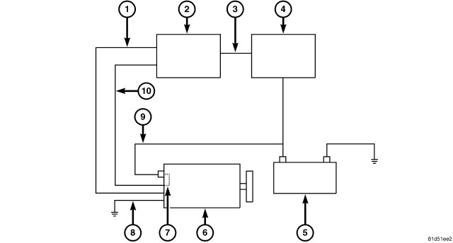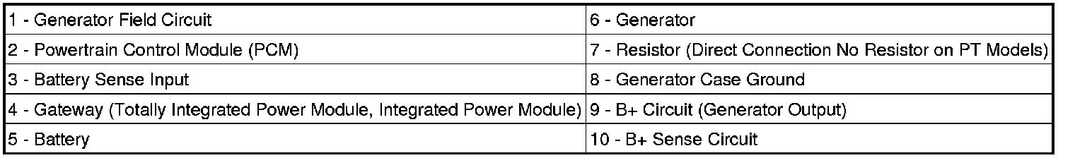 Voltage is monitored at B+ sense circuit (10) to insure the cable is connected. If the B+ circuit (generator output) (9) cable is loose anywhere in the circuit the B+ sense circuit (10) will show high voltage. This condition causes the PCM (2) to shut down the generator field circuit (1). Because of this feature, pin 2 of the field connector is internally connected to the B+ circuit (9).
