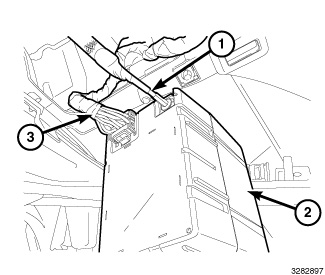 5. Continue routing the antenna harness (1) behind the kneeblocker towards the WIN module (2).