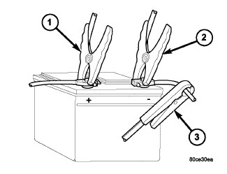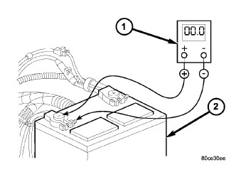 1. Connect volt-ampere tester (1) and (2) to battery terminals (Figure 1). See instructions provided by manufacturer of volt-ampere tester being used. Note: Certain diesel equipped models use dual batteries. If equipped with dual battery system, tester should be connected to battery on left side of vehicle only. Also, tester current reading must be taken from positive battery cable lead that connects to starter motor.