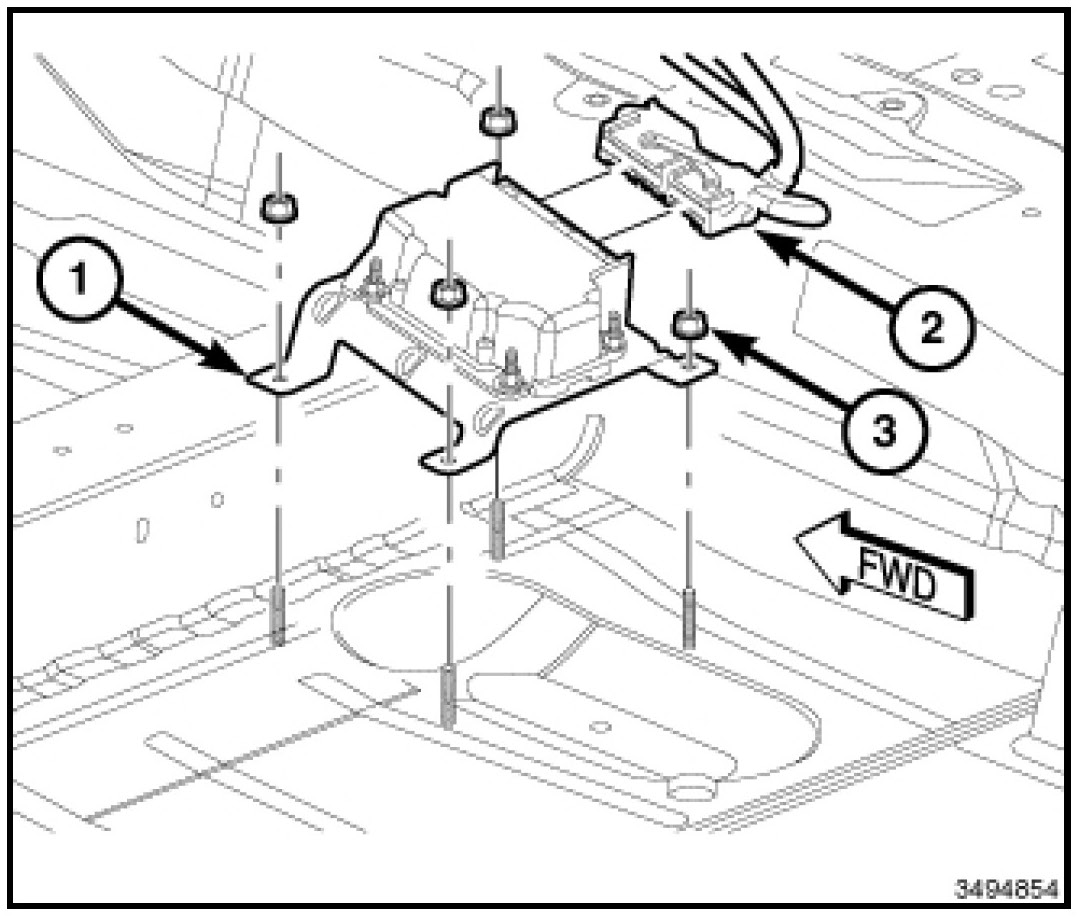 2. Install and tighten the four nuts (3) that secure the EPPM mounting bracket to the four weld studs on the floor panel. Tighten the nuts to 8 N.m (71 in. lbs.).