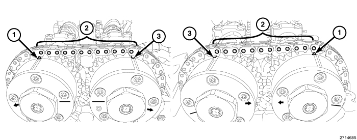 5. There should be twelve chain pins (2) BETWEEN the exhaust cam phaser triangle marking (1) and the intake cam phaser circle marking (3) as viewed from either the front or rear of the cam phasers.