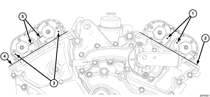 4. While maintaining this alignment, verify that the ARROWS (1) on the left side cam phasers point toward each other and are parallel to the cylinder head cover mounting surface (2) and that the right side cam phaser ARROWS (3) point away from each other and the SCRIBE LINES (5) are parallel to the cylinder head cover mounting surface (4).