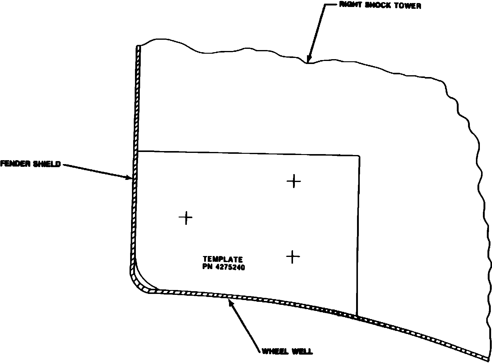 2. To mount the pressure regulator, tape the pressure regulator bracket template, PN 4275240, to the right side shock tower (Figure 5). (Set aside solenoid, when so equipped, to gain access.) Carefully locate the template against the fender shield and wheel well, being careful fo keep the top side of the template level. Center punch three screw hole locations and drill three .165" diameter (#21 drill) holes. Attach the pressure regulator bracket, PN 4306973, with three selftapping screws, PN 6031991, and tighten securely (Figure 6).