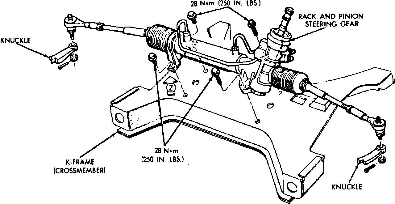 In the event a steering gear-to-crossmember (K-frame) attaching bolt/nut is cross-threaded or broken during steering gear installation or removal, it is no longer necessary to replace the crossmember (K-frame). Only the damaged bolt/nut need be replaced as described in the following procedure.