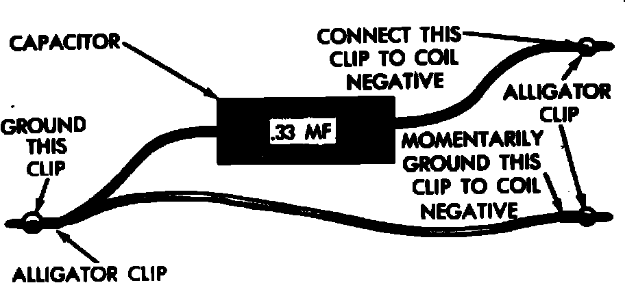 4. Connect special jumper wire, Fig. 2, to coil negative terminal. Turn ignition On, position coil high tension lead as described in step 1, then momentarily touch other end of jumper wire to a good ground.